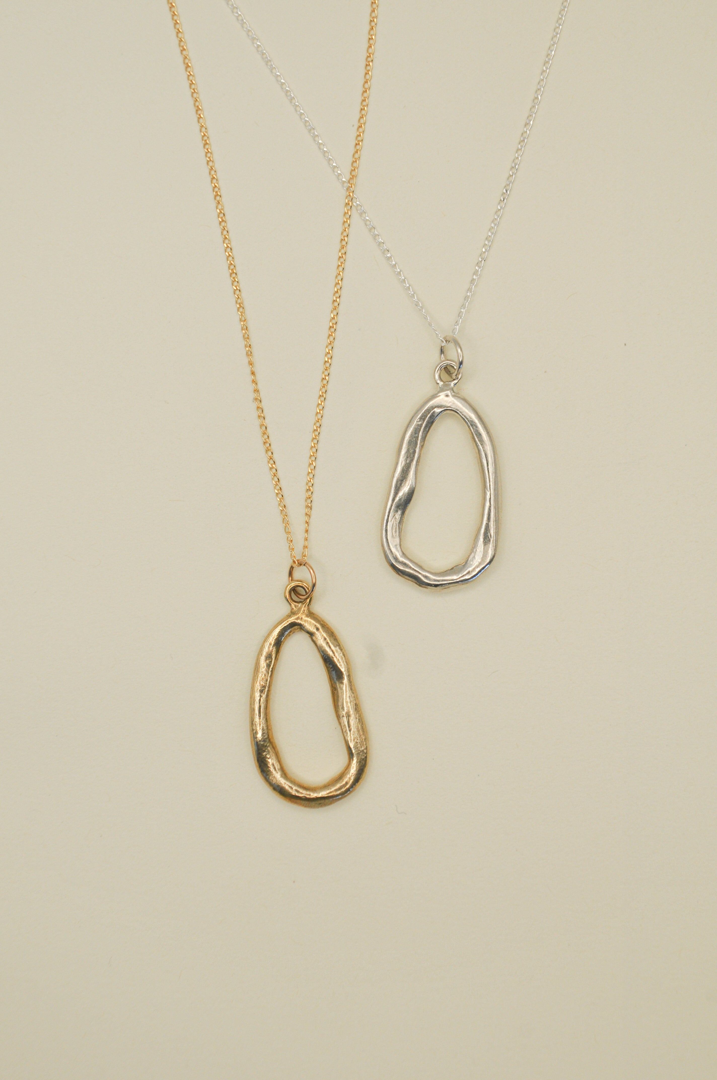 Hand carved and lost wax cast in either brass or sterling silver. Hangs on a coordinating 14k gold fill or sterling silver curb chain.