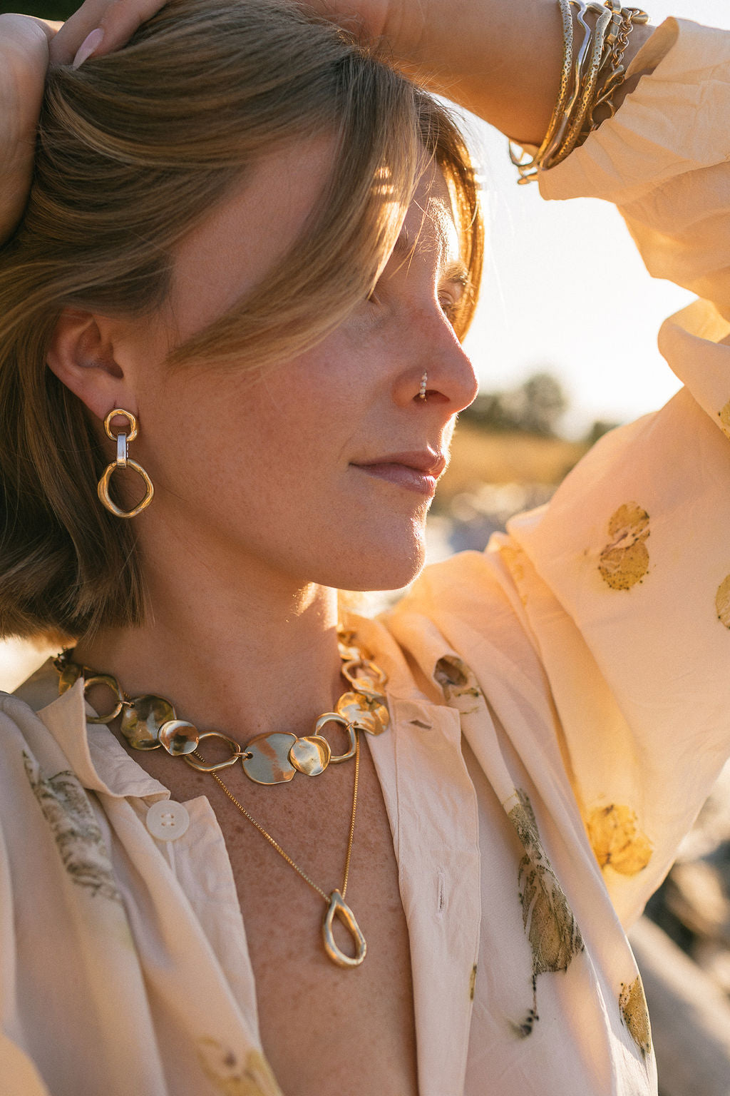 We use both brass and silver, along with 14k gold fill chains and ear wires for our jewelry pieces. Out brass is a high quality brass called "jewelers brass" which is a close color match to 10k gold. This alloy allows for daily wear that's waterproof and resists tarnish.