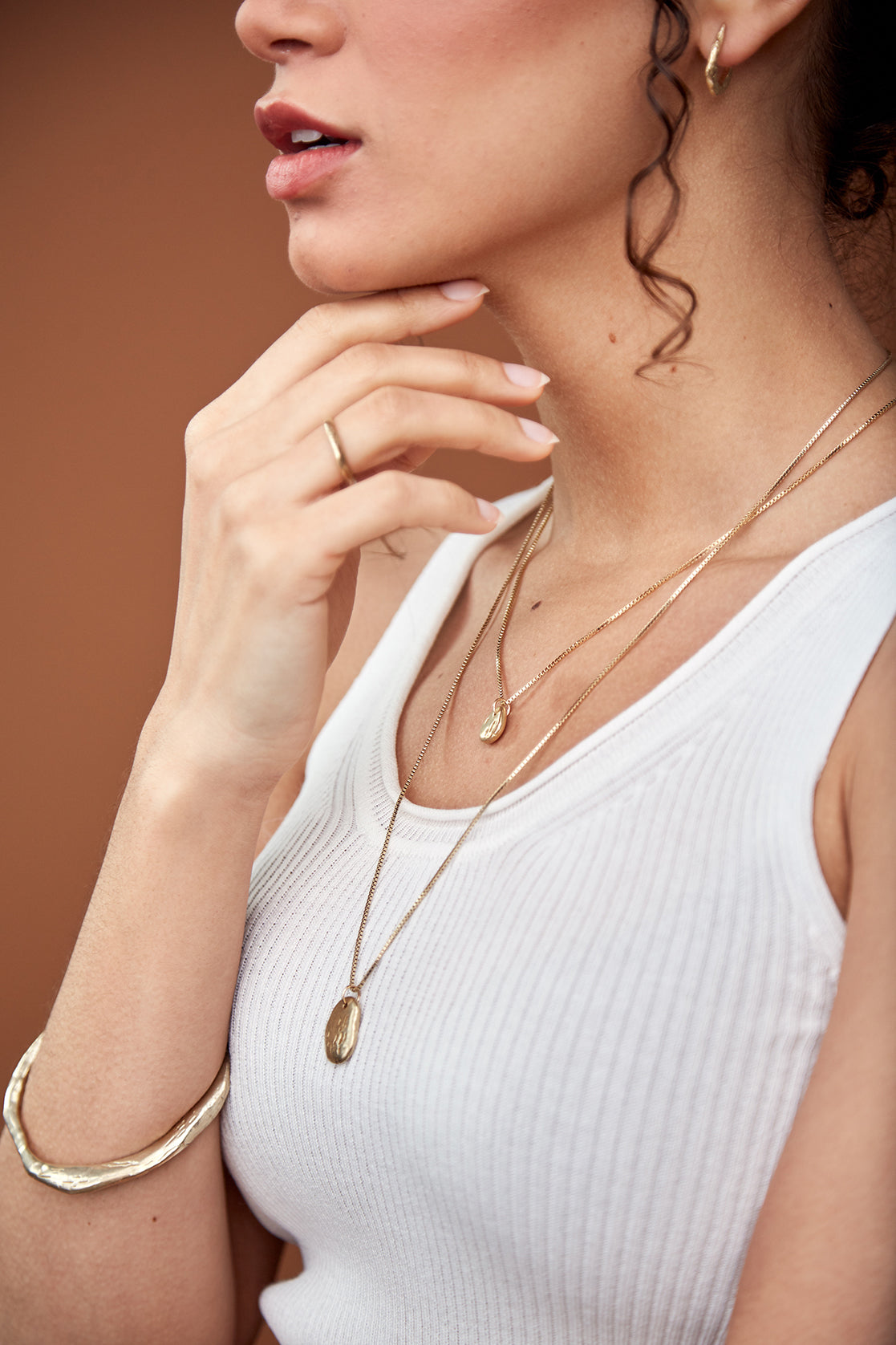 All of our brass pendants are hung from 14k gold fill 1.2mm box chains. Sterling silver pend are hung from coordinating sterling silver 1.2mm box chains.