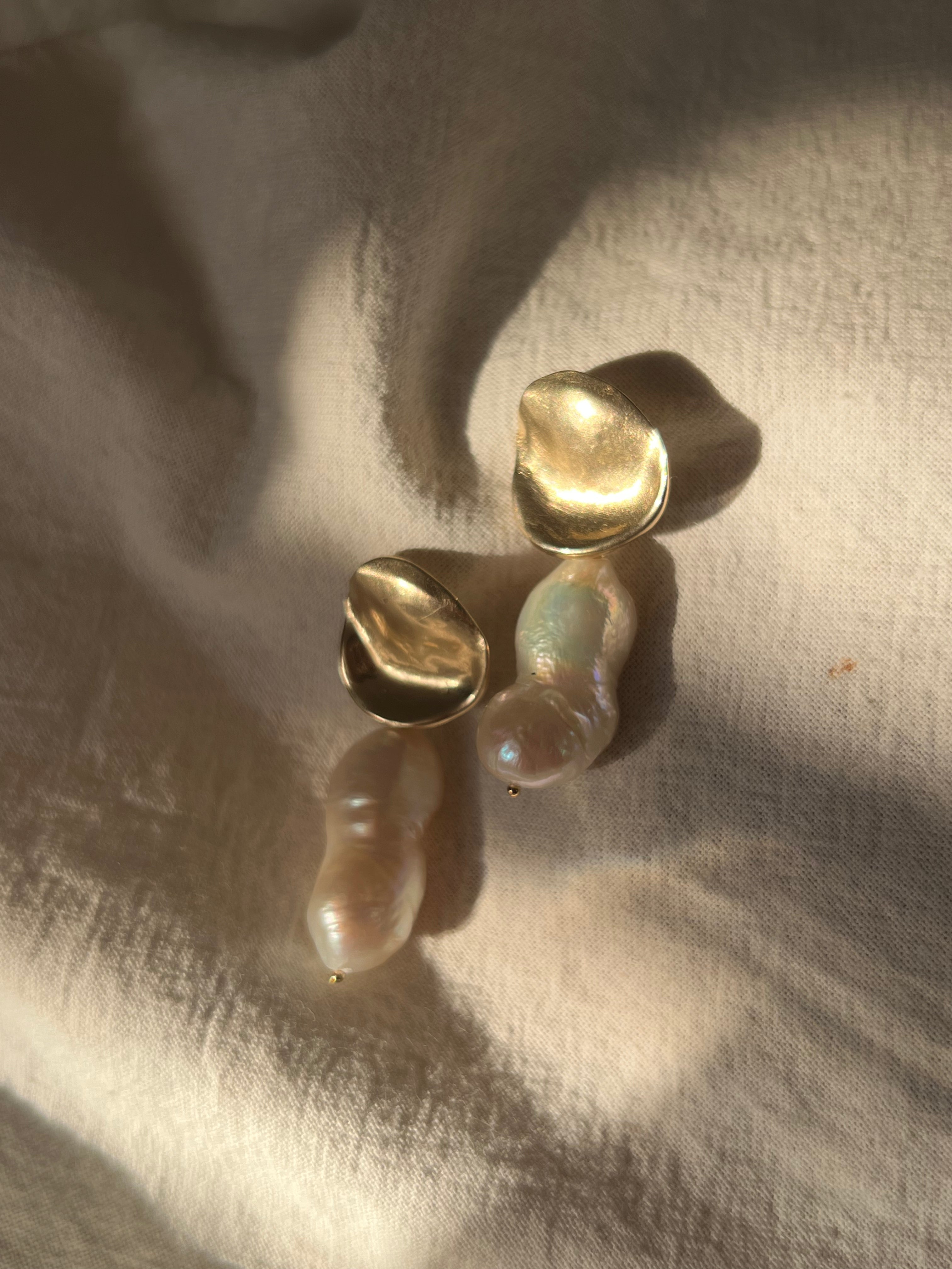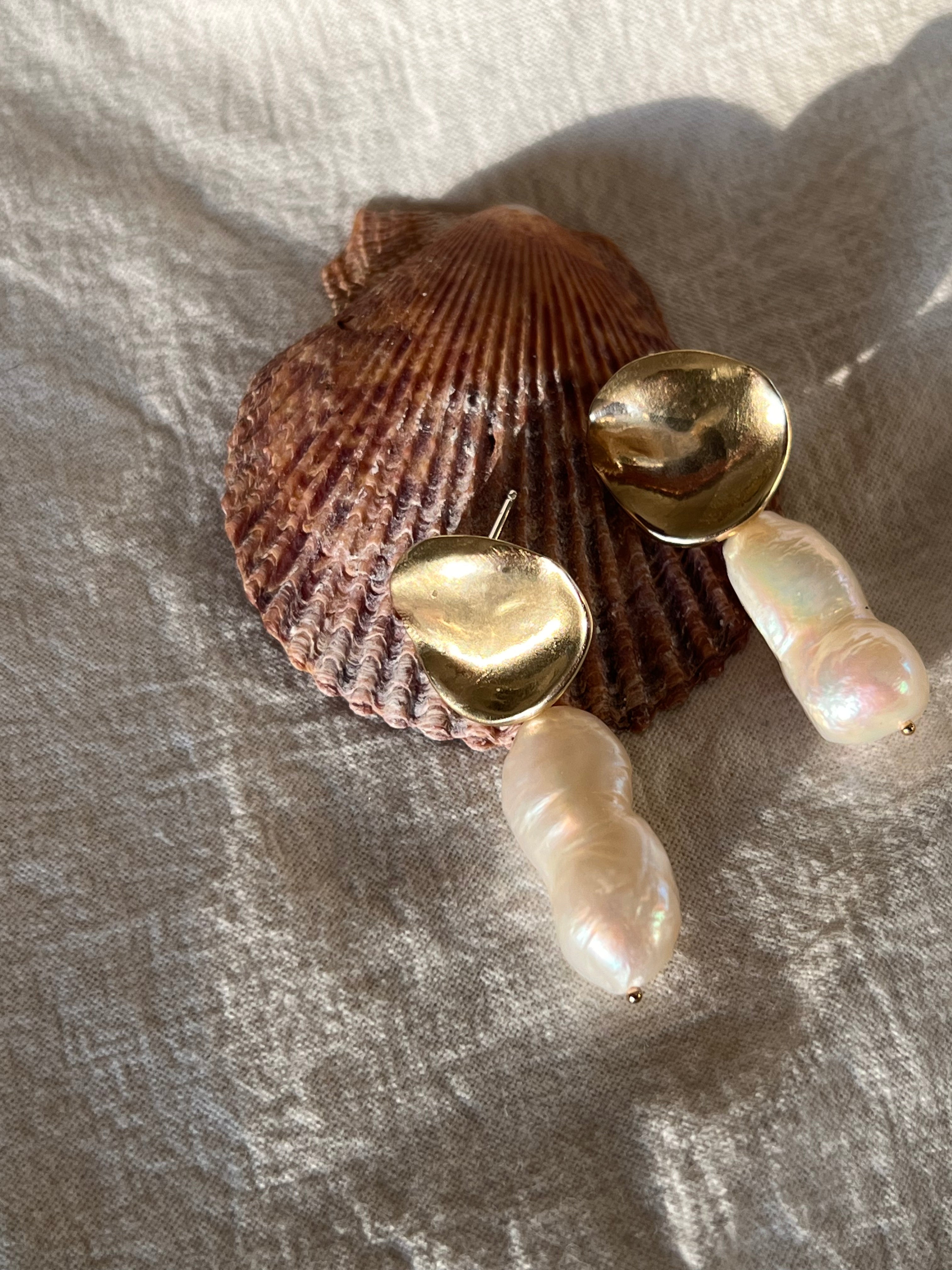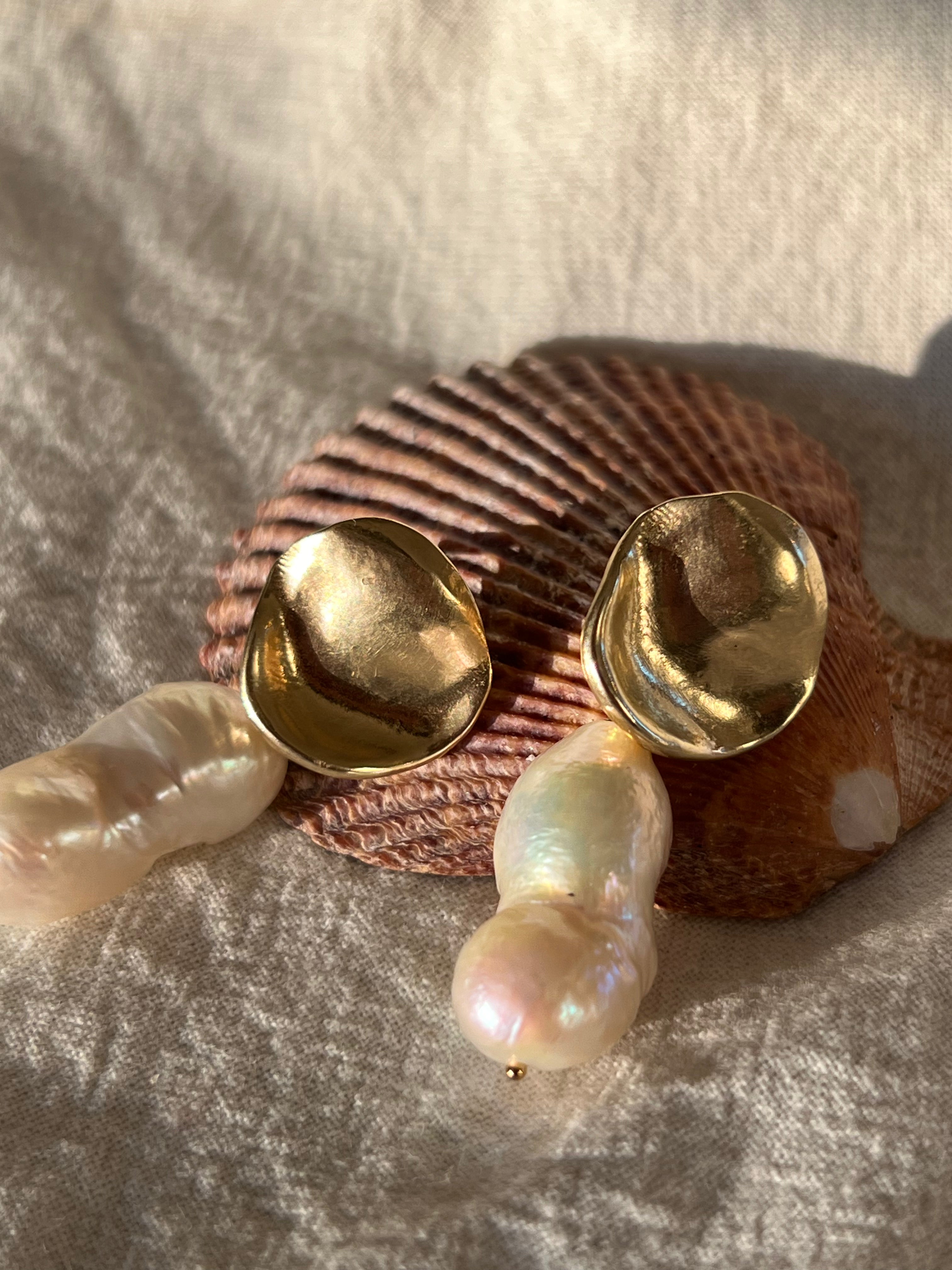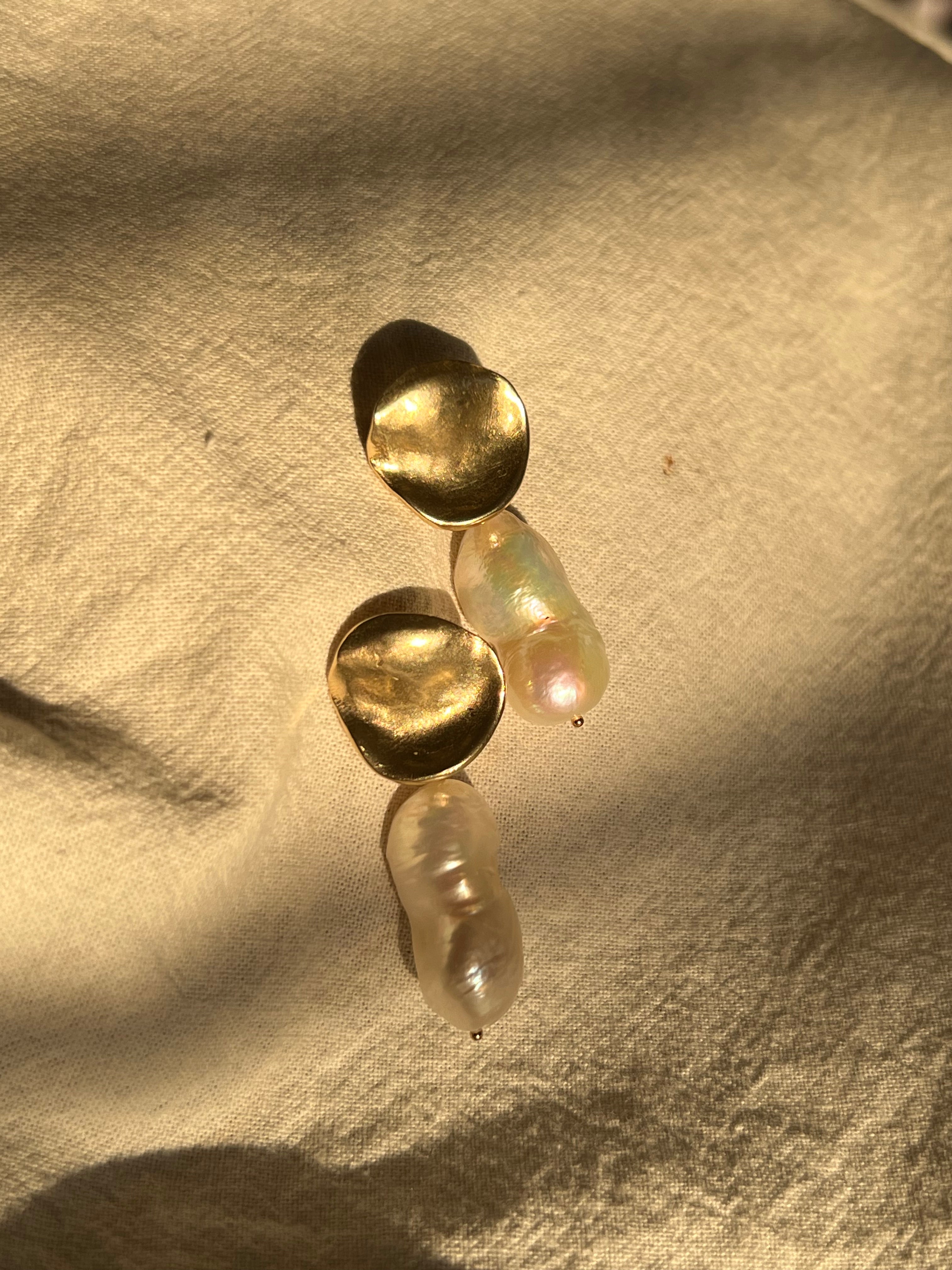 A beautiful unique baroque pearls hangs from a brass or sterling silver element. Every pearl is different and no pair will have identical pearls. Your pair will be uniquely your own as no two are alike.
