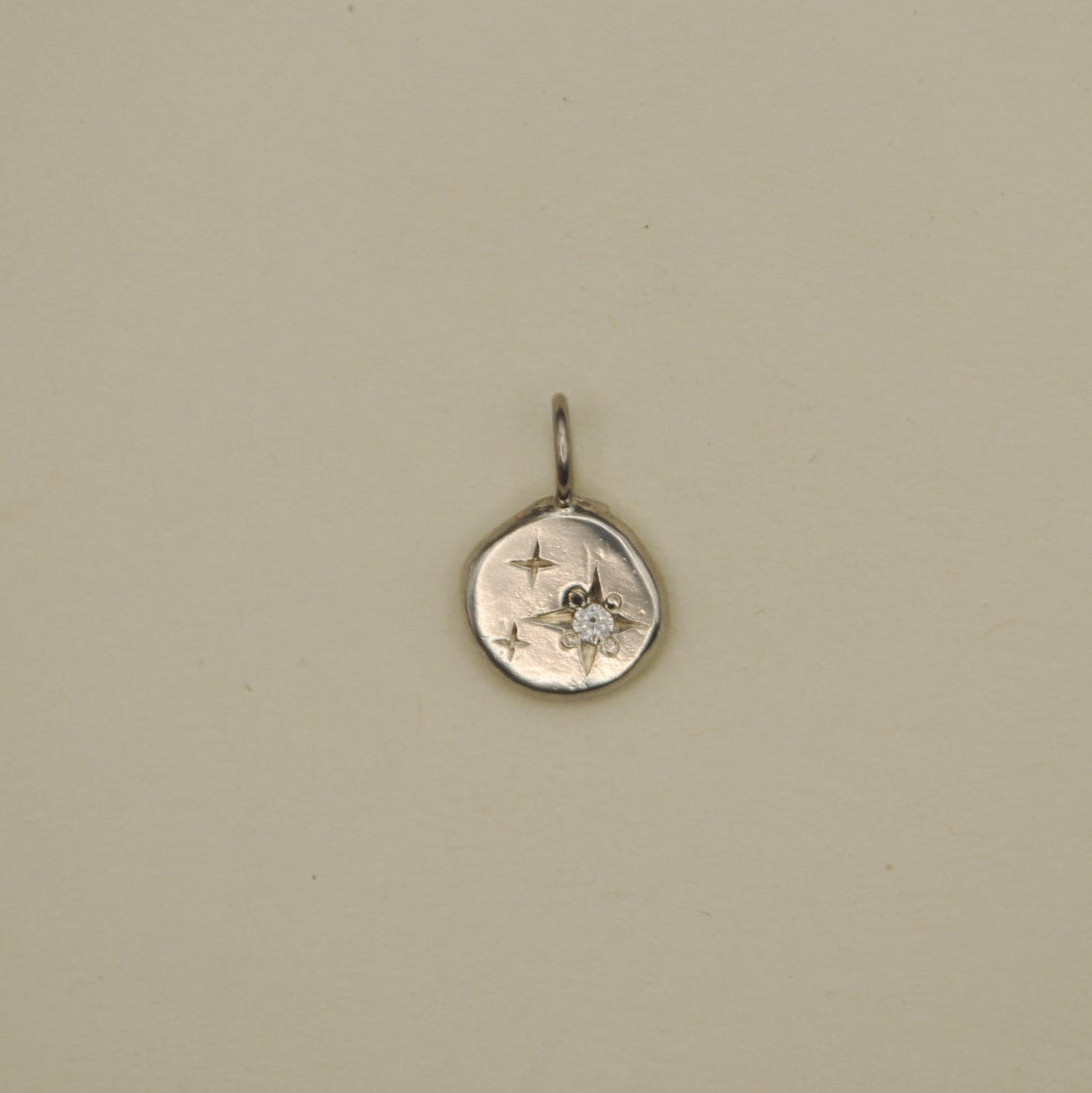 This sweet little pendant is hand engraved with a star setting and tiny little stars around it, and flush set with a sparkly 2mm cubic zirconia.  It's the perfect addition to your necklace stack!