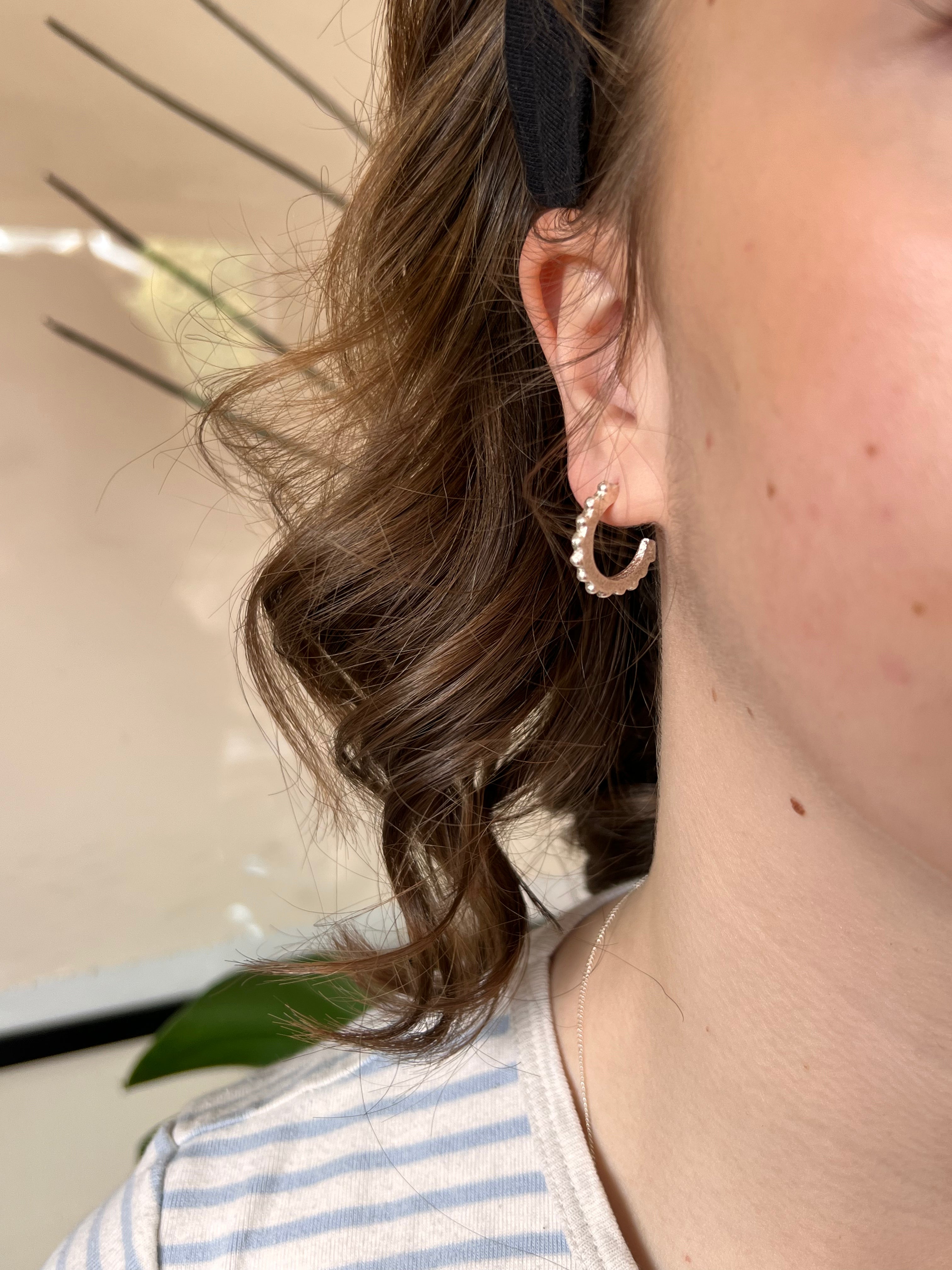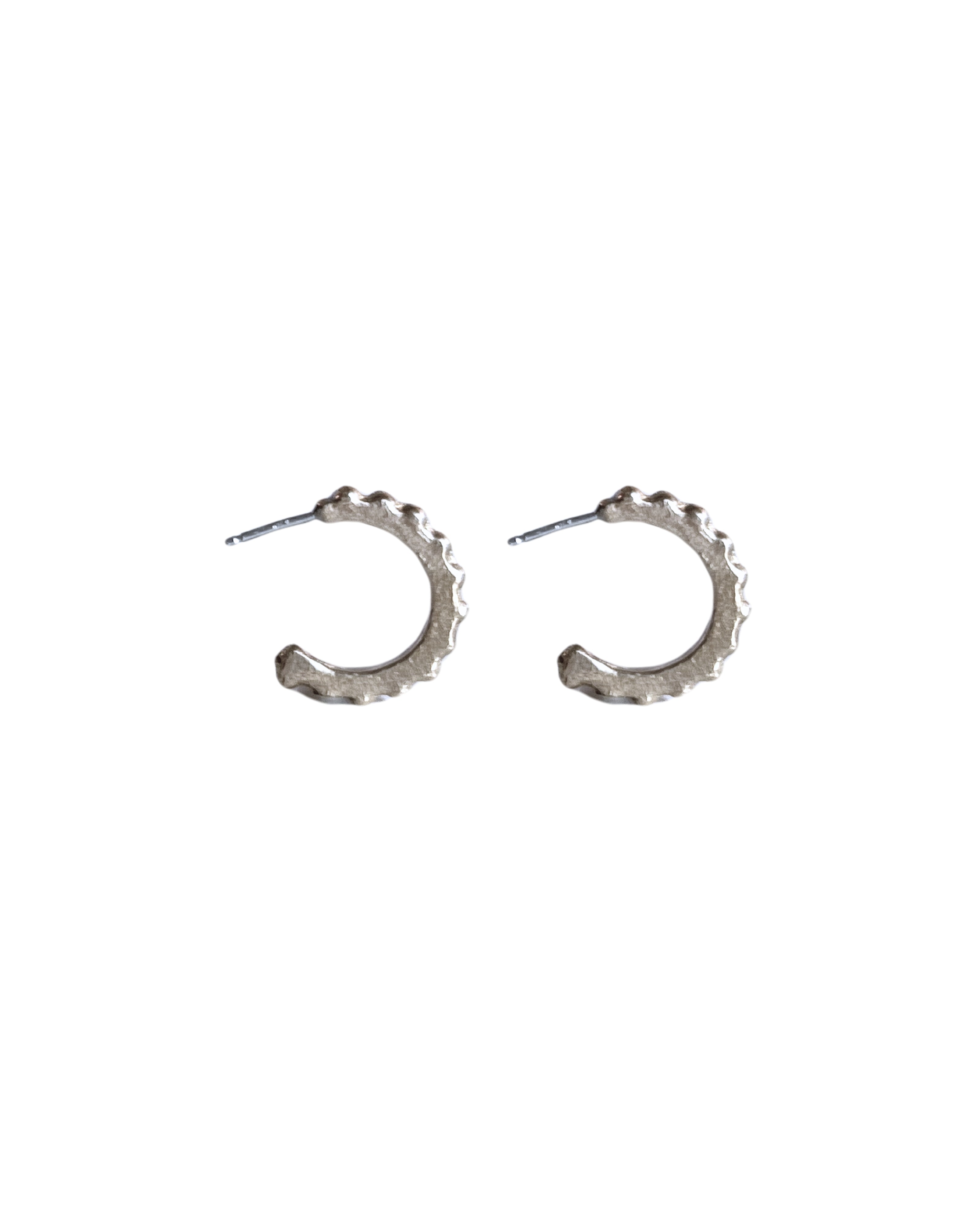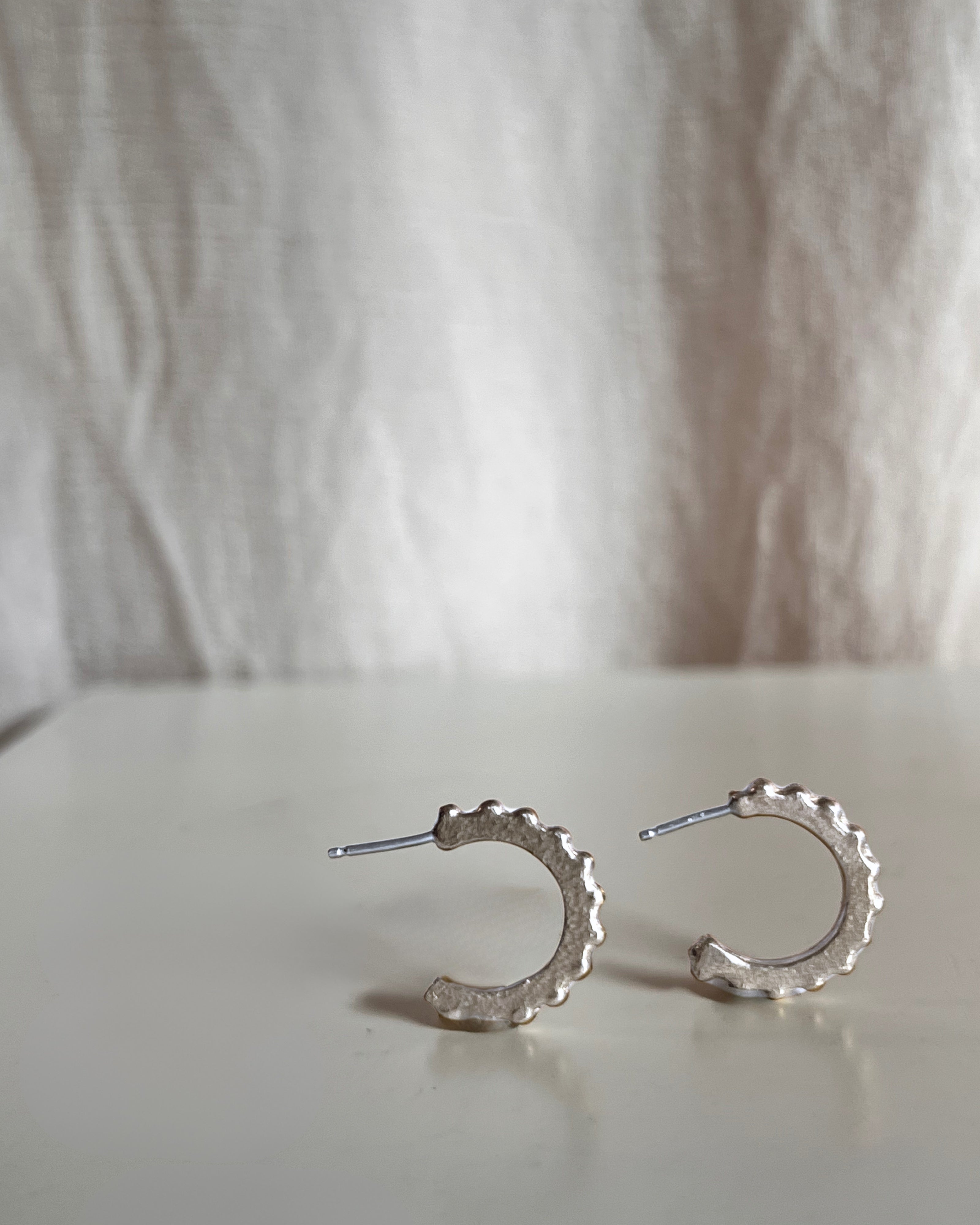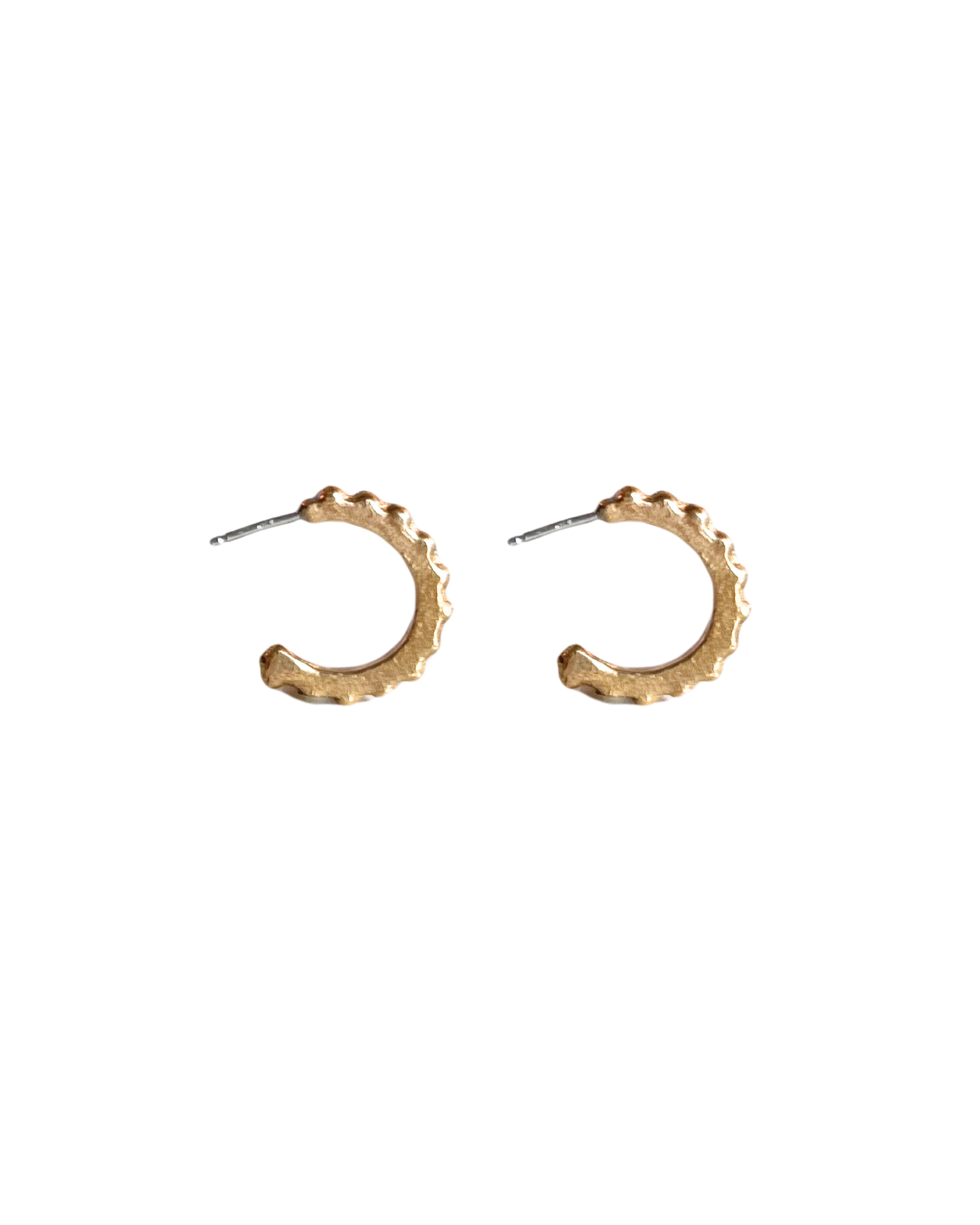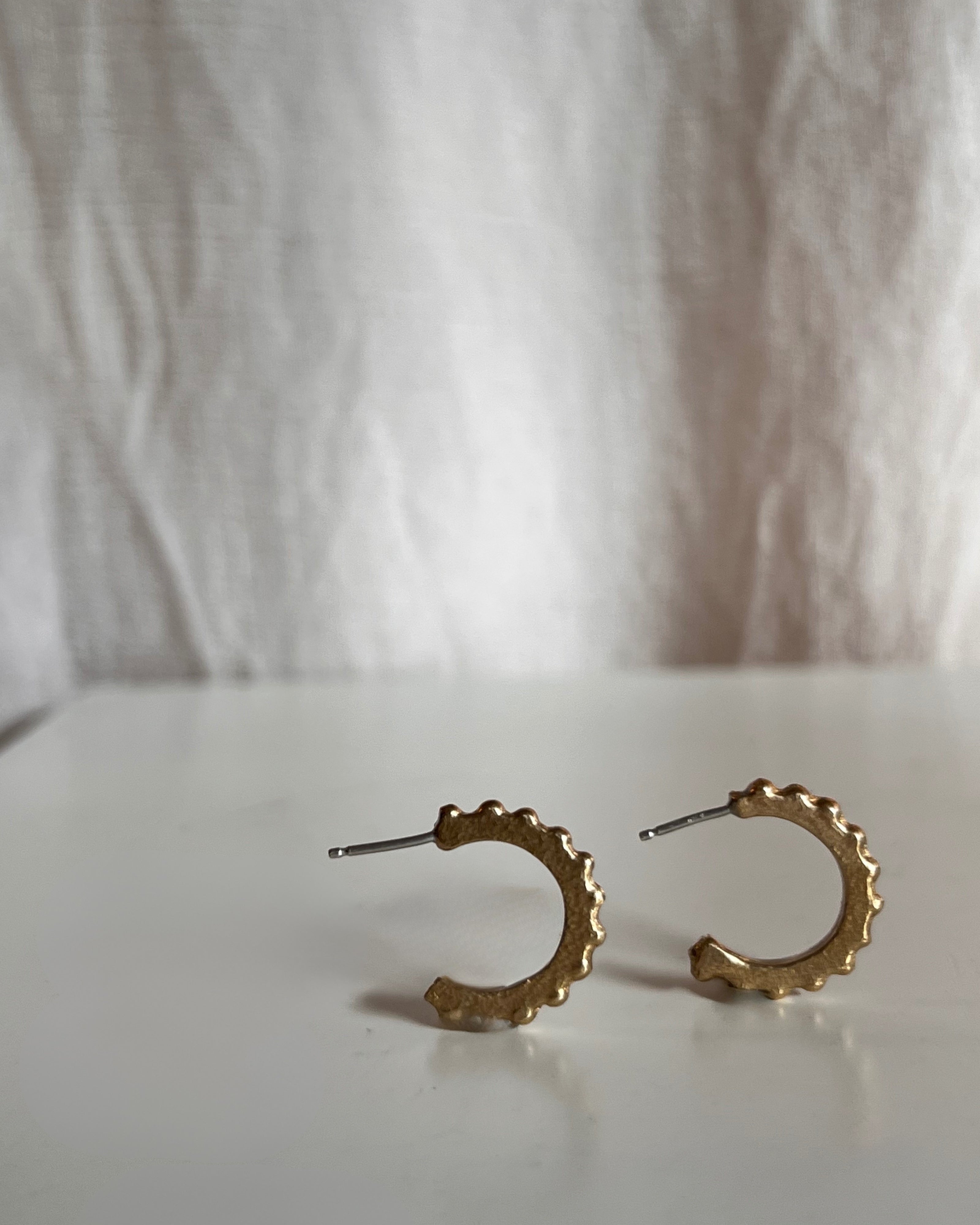 Your new every day hoop! These hoops are hand carved in wax and cast one at a time in sand which creates a beautiful texture. Made to order! Available in solid brass with a sterling silver post, sterling silver or 10k gold.