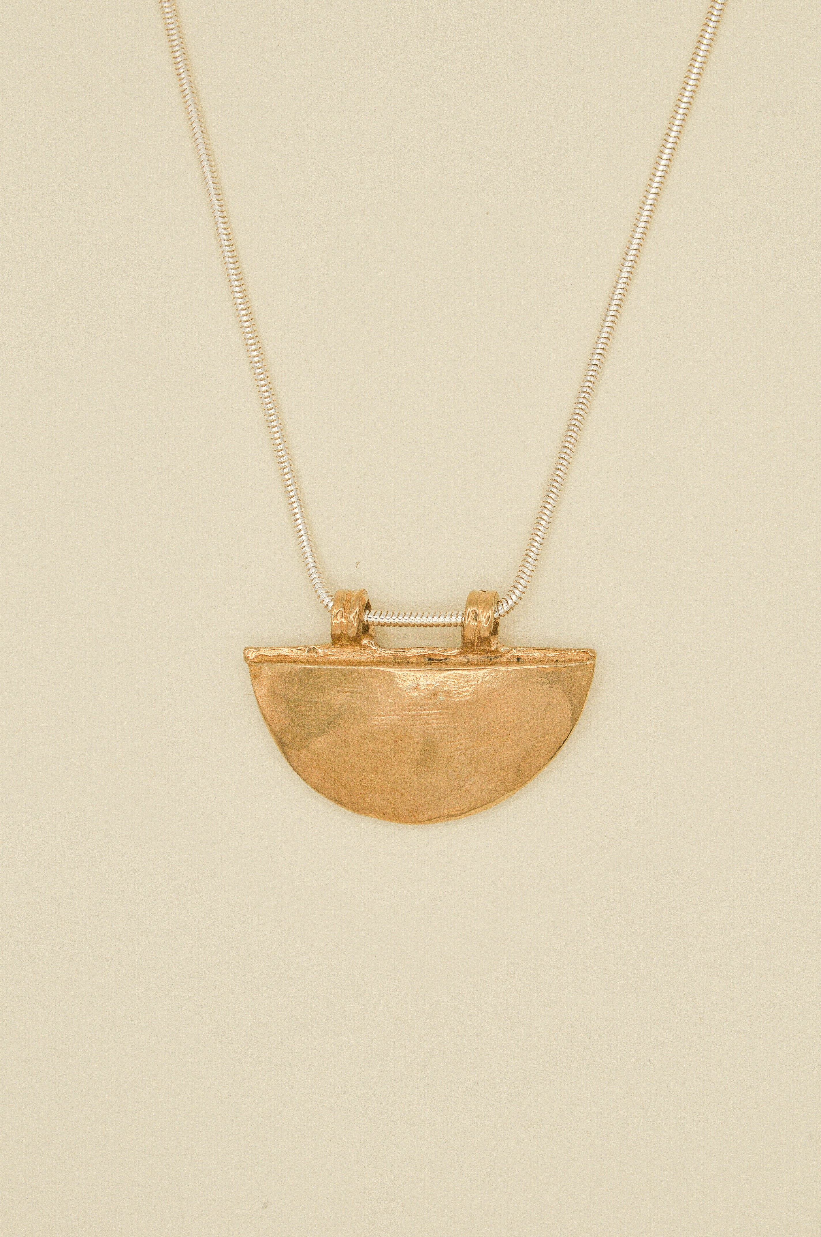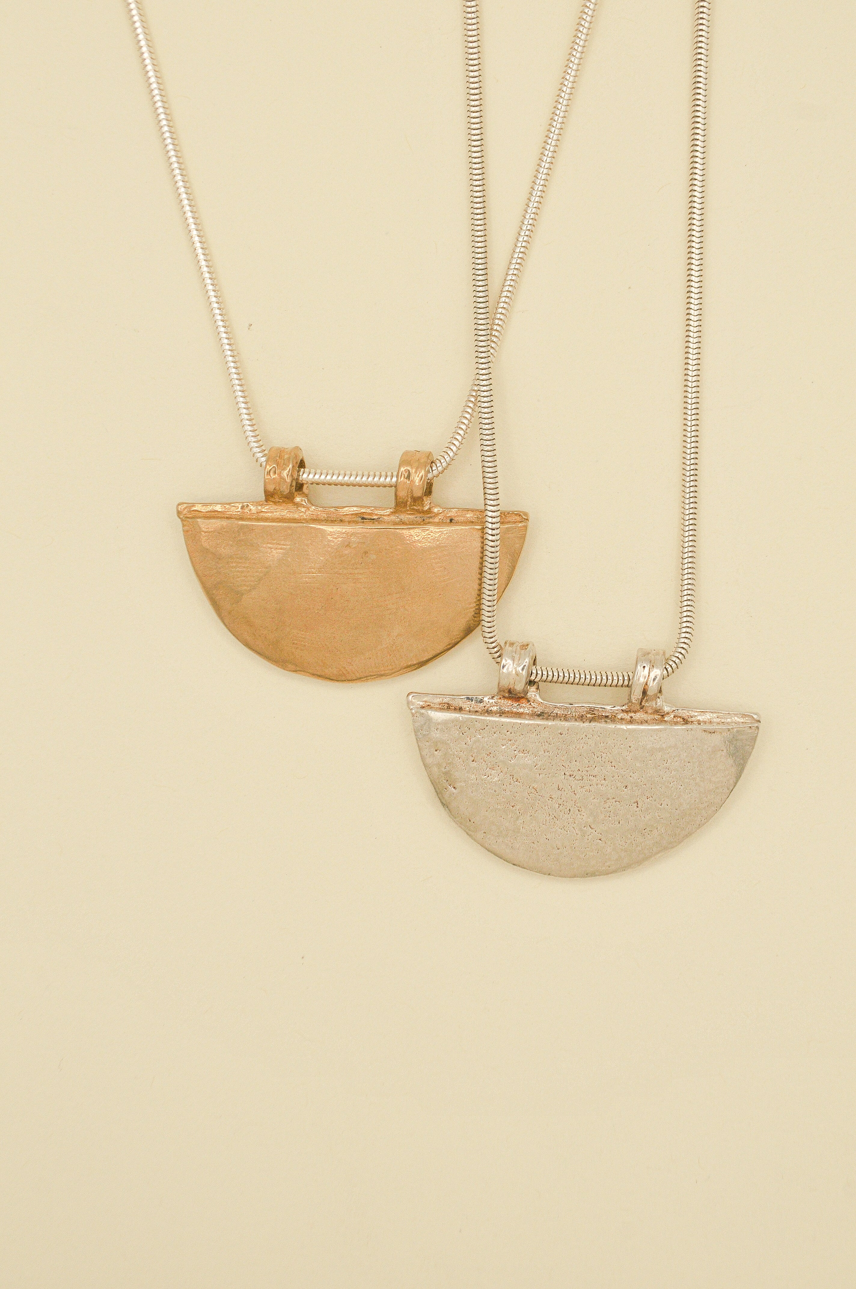 Hand carved and lost wax cast in either brass or sterling silver. Hangs from a sterling silver snake chain.