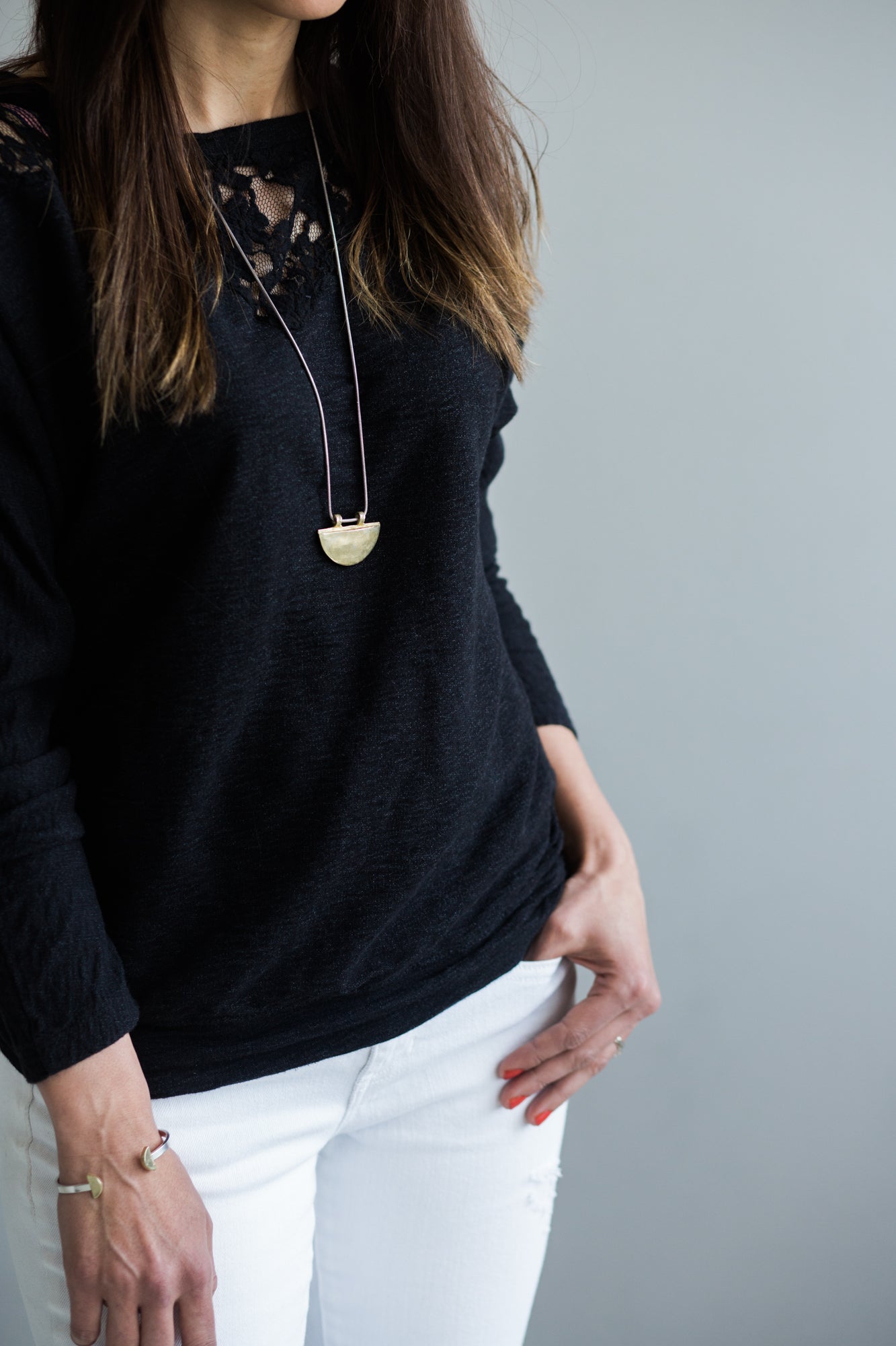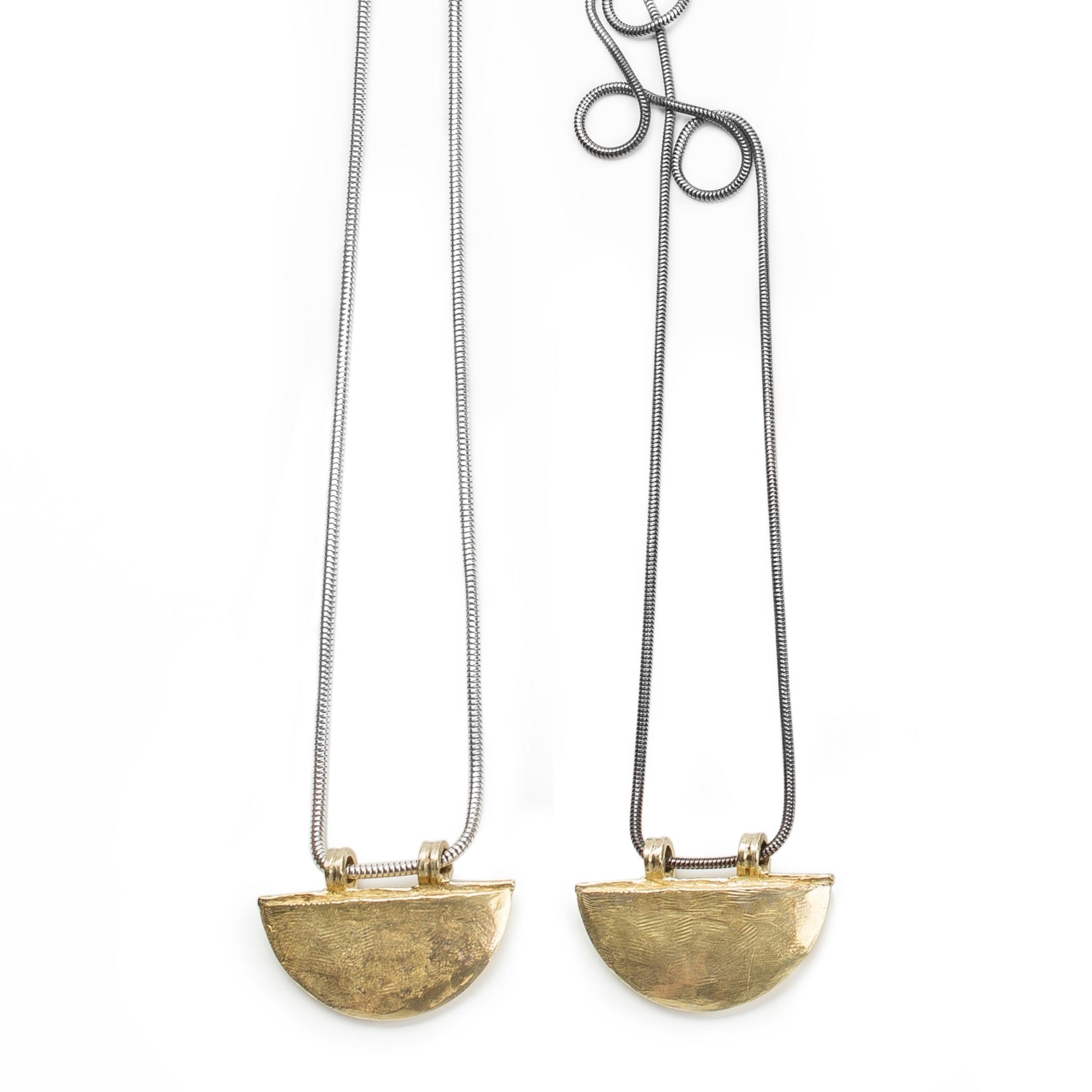 All of our brass pendants are hung from 14k gold fill 1.2mm box chains. Sterling silver pend are hung from coordinating sterling silver 1.2mm box chains.