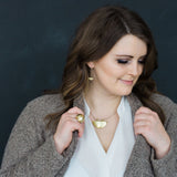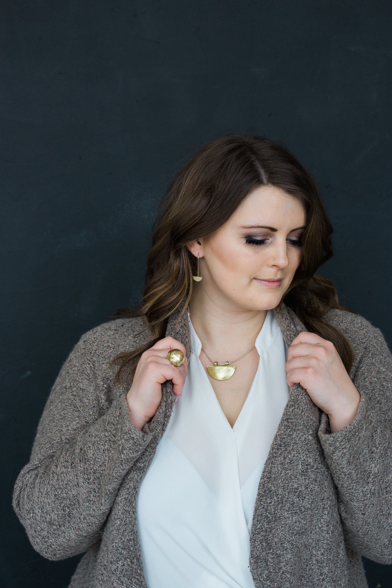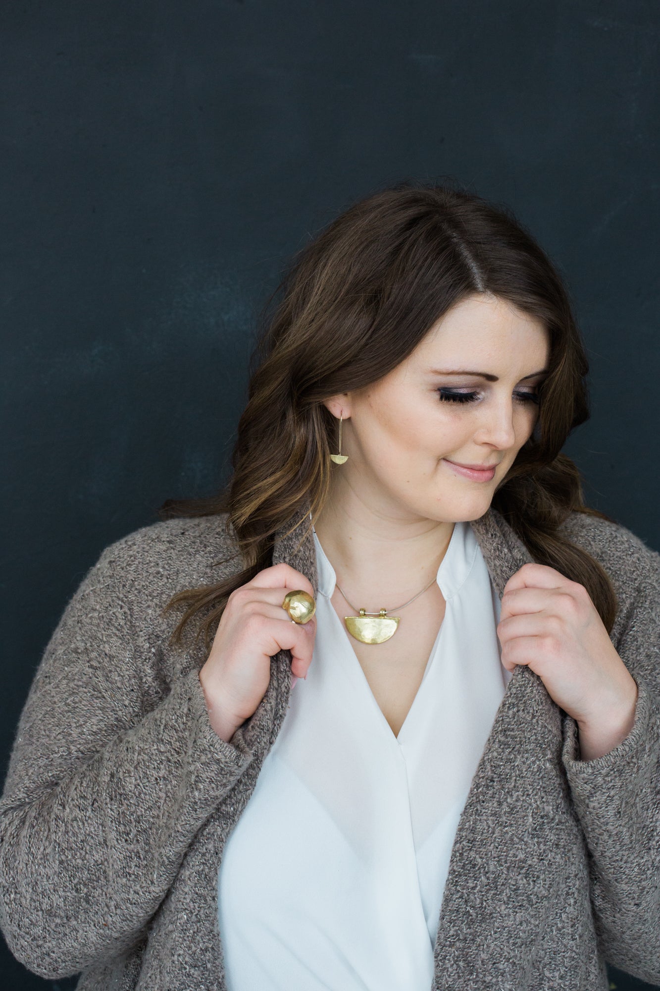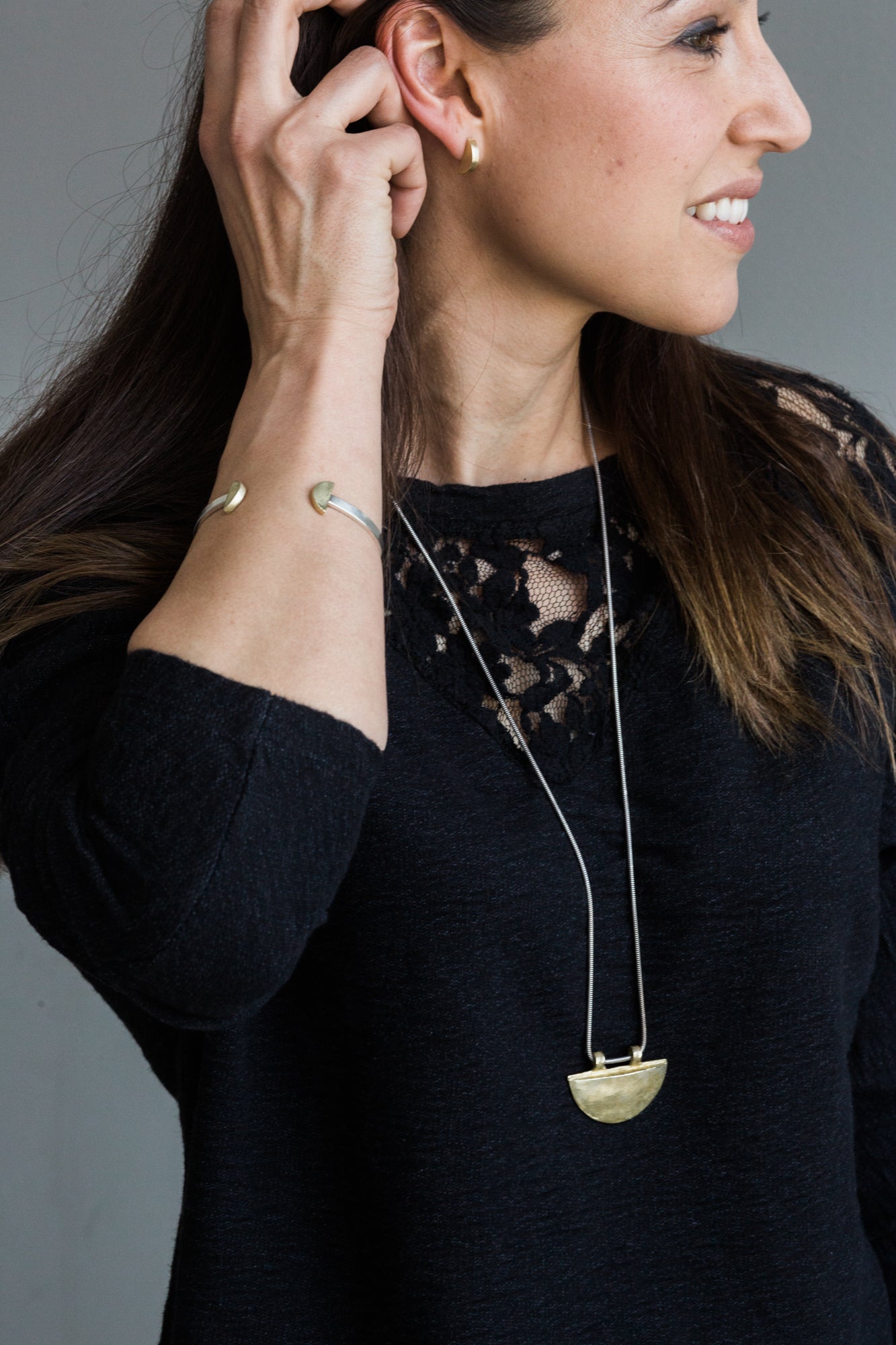 We use both brass and silver, along with 14k gold fill chains and ear wires for our jewelry pieces. Out brass is a high quality brass called "jewelers brass" which is a close color match to 10k gold. This alloy allows for daily wear that's waterproof and resists tarnish.